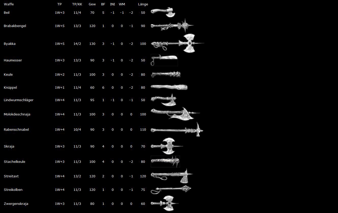 Gew: Dieser Wert benennt das Gewicht der Waffe in Unzen. Eine Unze entspricht 25 (irdischen) Gramm. (Ein Schwert mit 80 Unzen wiegt also 2 kg.)