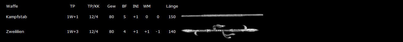 StĂ€be: Ein einfacher Holzstab von etwa acht Spann LĂ€nge (160 cm) kann eine durchaus effektive Waffe sein, wenn er von einem Meister seines Fachs gefĂŒhrt wird - und meist sind KampfstĂ€be keine ‘einfachen Holzwaffen’, sondern speziell gehĂ€rtet, mit MetallbĂ€ndern umwunden oder gar mit Klingen an beiden Enden versehen. Die gleichzeitige Verwendung eines Schildes ist nicht möglich.